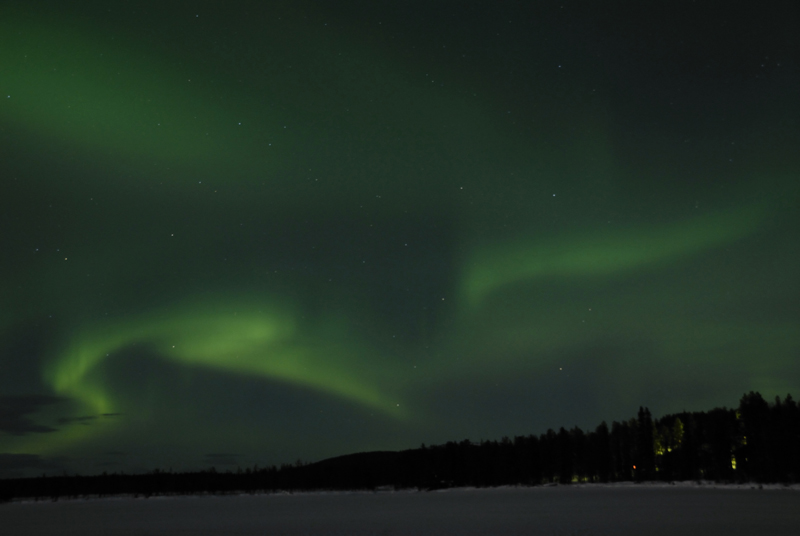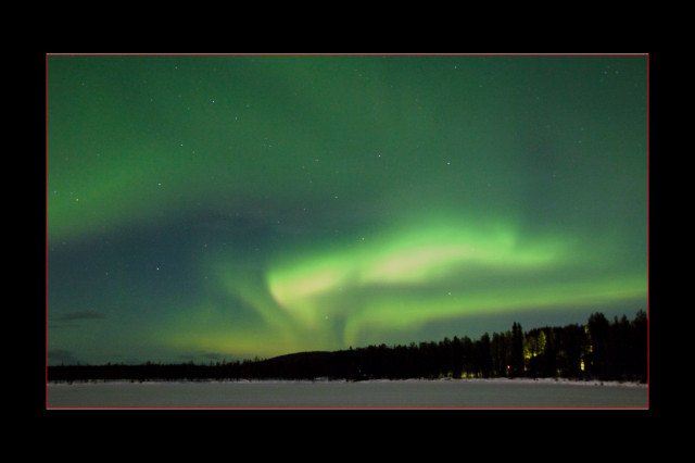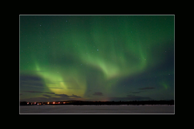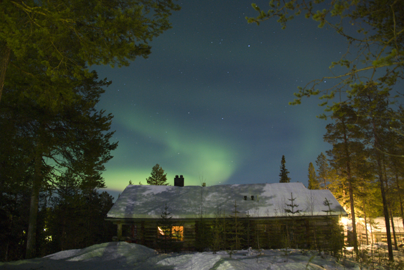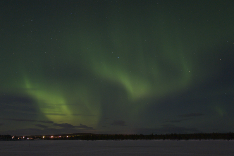 ![]() Polarlicht über finnischen Blockhäusern und Wäldern, Äkäslompolo, 18. Dezember 2007, 22.59 Uhr, Nikon D-200, 35 sek. belichtet mit Sigma 18 mm Objektiv, Blende 3.6, ISO-400.