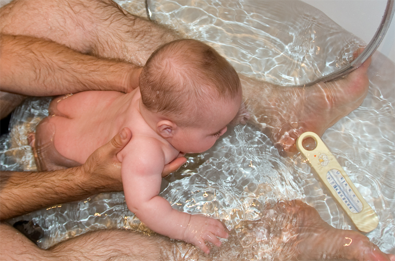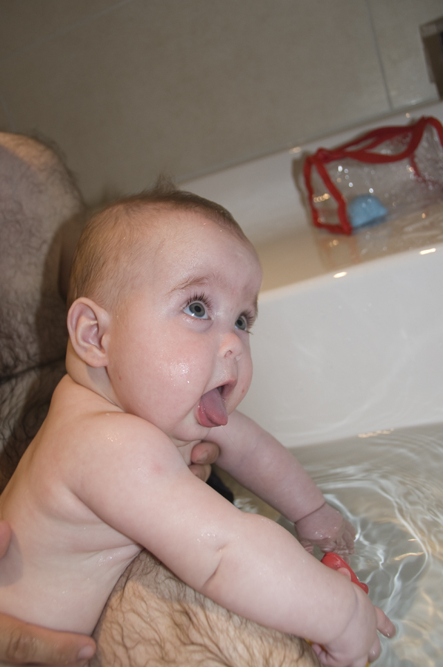 min erschte bes feschti Nahrig. Jetzt gohts noemme so lang, bes i denn wieder emol no anderi Sache bechome. Nach dem hani denn no choenne go Bade. ha denn mi Gspass gha em Bad met em Papi. Au s' Mami wo hed woelle fotografiere hani licht nass gmacht.