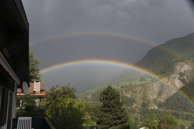 Donnerstag, 23. August 2012 Mer send am Morge lang legge bloobe. Mer goend no chorz of Eyholz ond chaufid de no oeppis a Sache i foers Grilliere i de Metzg. Mer goend den no go es Glace nä im Restaurant Tunetsch. Die hend grossi Glace det. Es chond cho Stoerme ond es git es paar Tropfe Räge. Ech gniesse das omeluege. Mer spielid vel zäme ond ech wot au scho mitsinge bem Singe us dem Buechli met de schwiizerlieder. Am Obig rägnet es weder e chli. Es ged en wonderschöne Rägeboge.