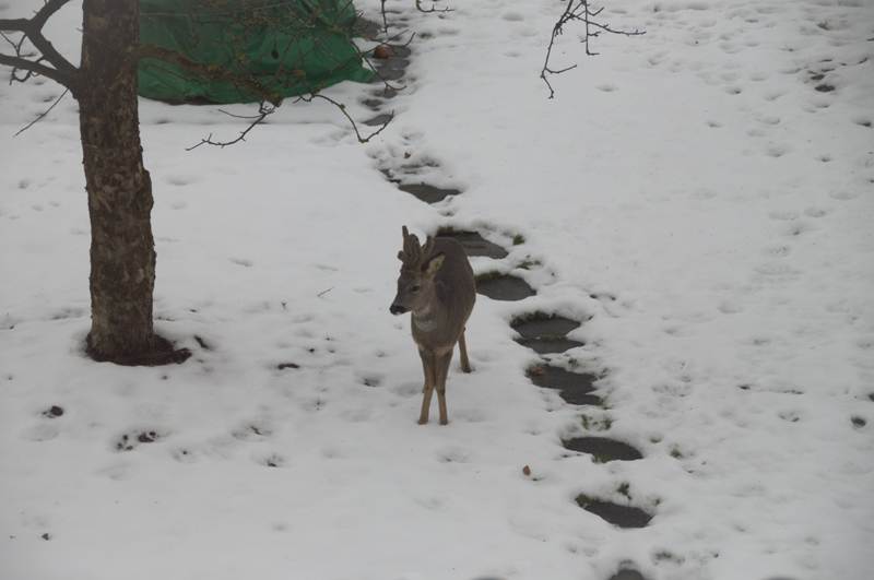 Es chliises Zeiche foer en spezielle Tag. Am Morge früh esch en Rehbock be üs em Garte gseh.