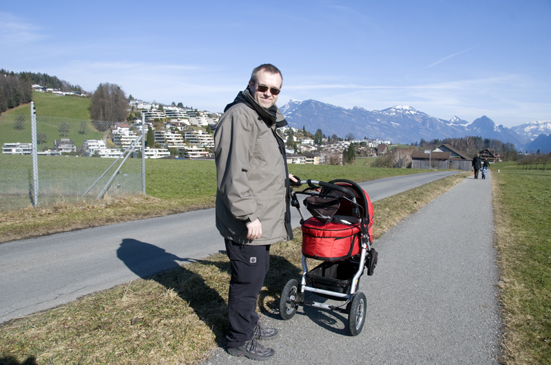 Das hät de Papi au nie dänkt vor eme Johr, dass er no einisch en Chinderwage darf omestosse. I de Nacht send die Chraempfli no do gseh, doch noem so fescht. Erscht wos Mami denn zo mer gluegt hed ab de 2 i de Nacht sends weder cho. Sie hed denn lang muesse zo mer luege. Bem Papi hani vorher voul woelle Trenke. Er hed mer no muesse Zuschlag ghä.