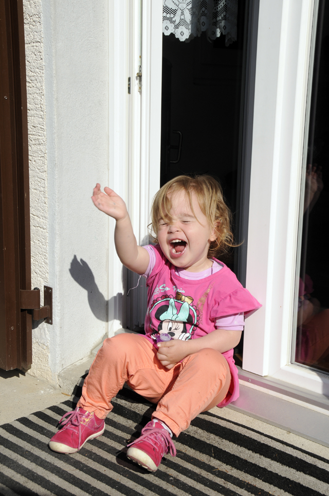 Am Nommitag speli met em Papi dosse ond esse alli Aerdbeerli wo bem Chemine wachsid. Mer goend denn id Taverne go aesse. Ech be ganz en liebi ond esse Chichen Nuggets ond Pommes. Ech darf au vom Mami ond Papi no e chli aesse. Ech chome vo de Frau det no es Seifibloetterli oeber. Met em Papi machi denn s^Fürli ond nehme denn vorem Führ mini Latte.