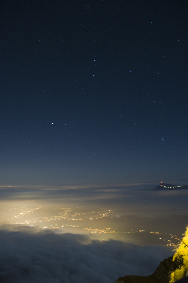 Bleck vom Pilatus noch Horw ond Lozärn. Obe no d'Plejade ond d'Capella em Fuhrmann. Vo hende luechted no de Mond ond macht d'Omgäbig hell.